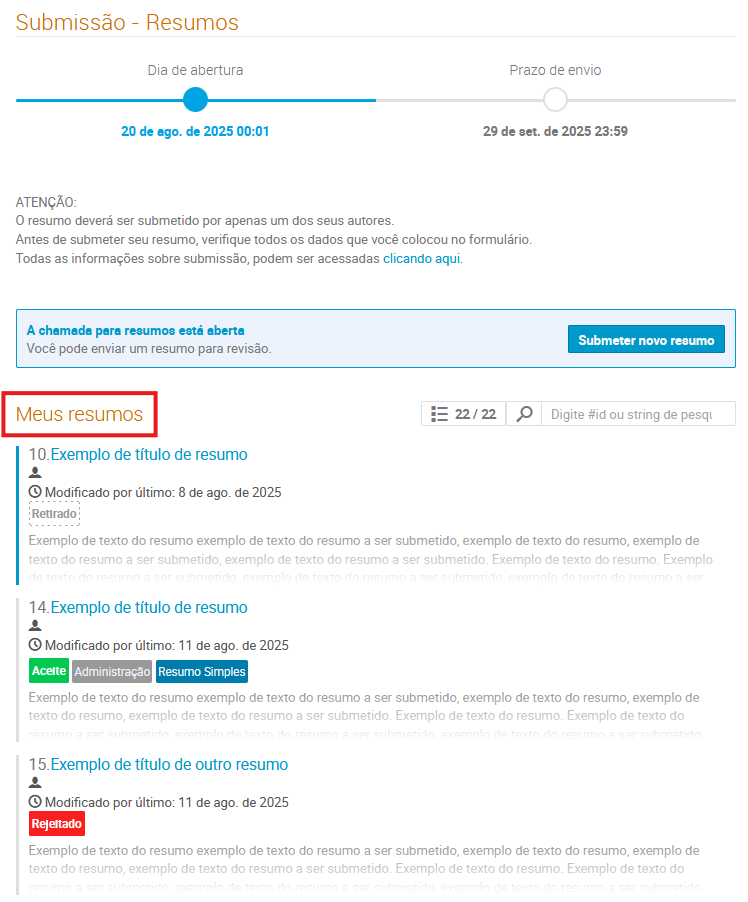 3. Todos os resumos que você submeteu serão listados na tela “Submissão - Resumos”, em "Meus Resumos":
